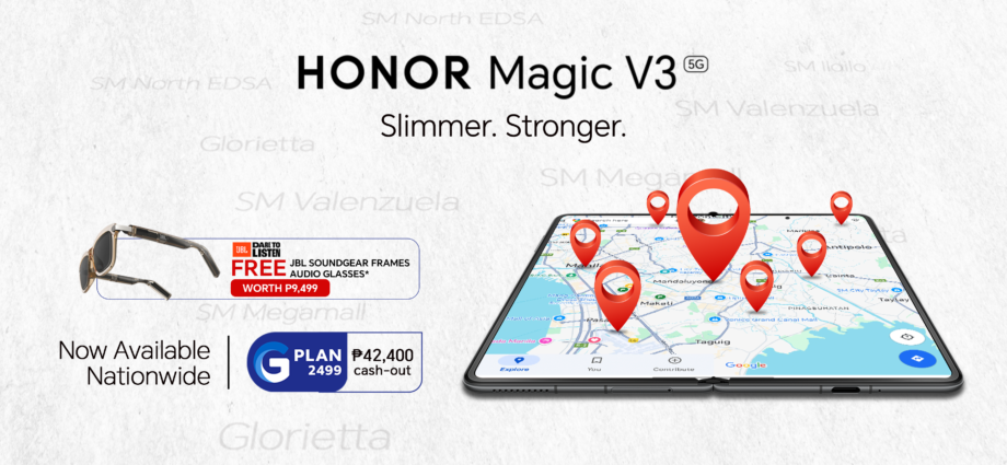 HONOR Magic V3 is now available at Globe Stores in: SM North Edsa, Robinsons Place Ermita, SM Mall Of Asia, SM Megamall, SM Valenzuela, SM Dasmarinas, SM Bacolod, SM City Butuan, SM Ilo-ilo, Glorietta 3 Makati, SM Legazpi, SM Bacoor, SM Southmall, SM Calamba, SM Davao, SM Tuguegarao Downtown, SM Marikina, SM Batangas, SM Urdaneta, SM Cabanatuan, SM Masinag, GLOBE Iconic BGC, SM Sta. Rosa, SM Fairview, Robinsons Place Dumaguete, Limketkai, and Robinsons Tacloban.