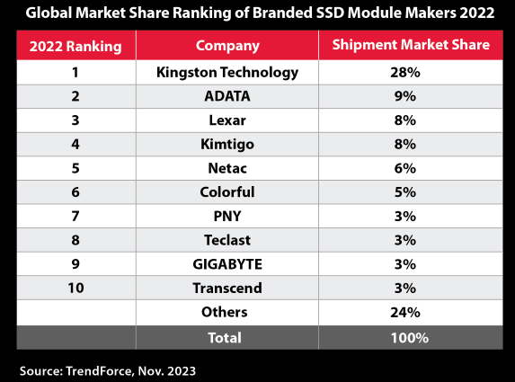 “It’s an honor to achieve this top ranking for another year”, said Kingston. “From the beginning, Kingston has remained steadfast in our commitment to serving our customers and channel partners across the globe, and it’s through these strong and enduring relationships that our SSD business has experienced remarkable growth. The recent findings from TrendForce serve as a testament to the dedication and hard work of our entire team, and we are grateful for the recognition and success we share with them.”