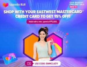 EastWest Mastercard cardholders can avail of a special 15% discount, up to P500, on their purchases at Lazada’s 11.11 sale. All you have to do is make a minimum spend of P3,000 and use the promo code EWMCLAZ11 at checkout on the Lazada mobile app on November 11.