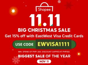 Meanwhile, EastWest Visa credit cardholders can also enjoy a 15% discount, up to P500, on Shopee’s 11.11 sale. Just make a minimum spend of P1,500 and use the promo code EWVISA1111 upon checkout on the Shopee mobile app on the same day.