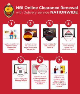 No more personal appearances, no more longer queues, making its services more convenient and hassle-free for Filipinos by simply accessing the NBI Website at https://clearance.NBI.gov.ph. In addition, it also gives the citizens the option to have their clearances picked-up from the NBI office or they can request for a door-to-door delivery service in 3 to 7 business days in Metro Manila and Luzon and 7 to 10 business days in Visayas and Mindanao.