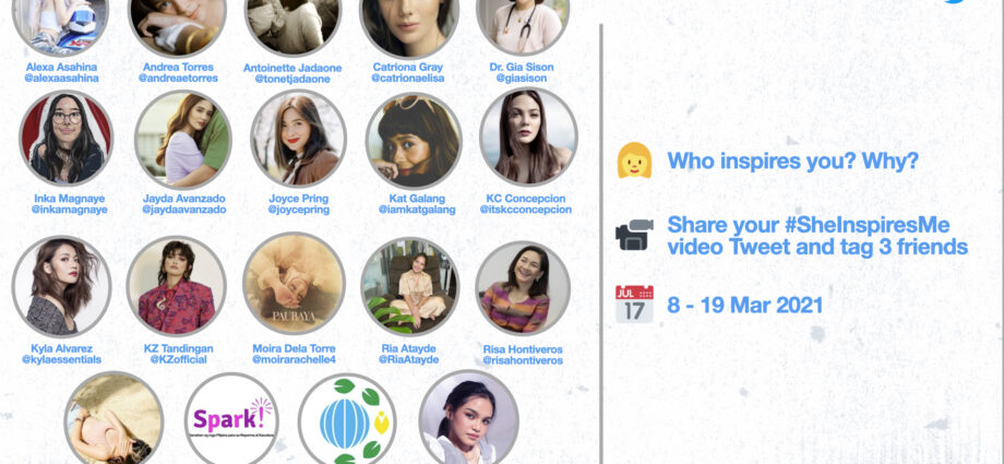 In the Philippines, Twitter is engaging with diverse communities led by Alexa Asahina (@alexaasahina), Andrea Torres (@andreaetorres), Antoinette Jadaone (@tonetjadaone), Catriona Gray (@catrionaelisa), Dr. Gia Sison (@giasison), Inka Magnaye (@inkamagnaye), Jayda Avanzado (@jaydaavanzado), Joyce Pring (@joycepring), Kat Galang (@imkatgalang), KC Concepcion (@itskcconcepcion), Kyla Alvarez (@kylaessentials), KZ Tandingan (@KZofficial), Moira Dela Torre (@moirarachelle4), Ria Atayde (@RiaAtayde), Sen. Risa Hontiveros (@risahontiveros), Sofia Pablo (@realsofiapablo), Spark! Philippines (@SPARKphils), Mitzi Jonelle Tan (@mitzijonelle) of YACA Philippines (@YACAPhilippines), and Zephanie Dimaranan (@imzephanie) who will each share a video Tweet about the women that inspire them.